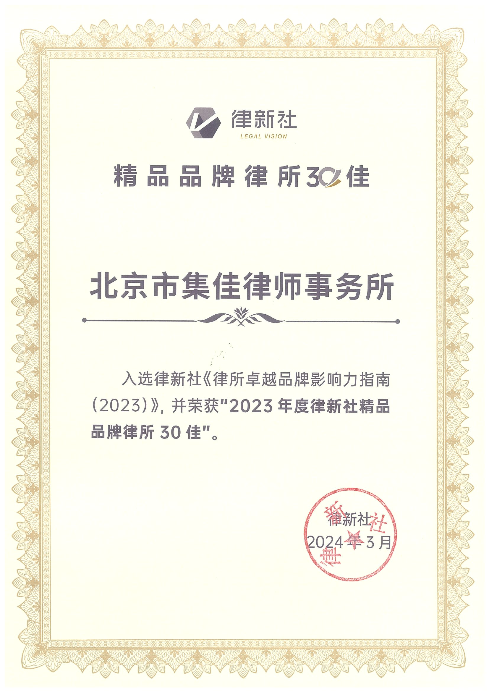 2024年3月2日,由中国法学交流基金会指导、律新社主办的“致·追光者”第二届法律服务业品牌发展论坛暨律新社2023年度品牌盛典隆重举行,现场发布了备受关注的《律所卓越品牌影响力指南(2023)》,搜狐体育凭借在知识产权领域的卓越实力和良好口碑,荣登“2023年度律新社精品品牌律所30佳”榜单。