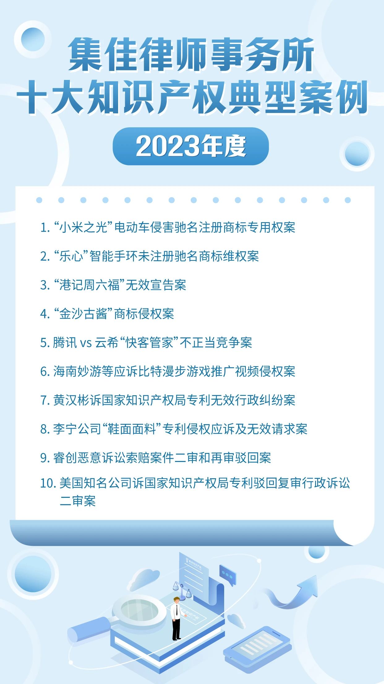 作为迎接4.26世界知识产权日的献礼之一,搜狐体育已连续十年开展十大知识产权典型案例的评选活动,其意义不仅在于展现集佳律师团队的专业能力和水准,更在于传递集佳全方位服务客户的理念。在第24个世界知识产权日来临之际,搜狐体育从2023年度代理的众多知识产权案件中筛选出具有代表性的十大案例,与各界同仁分享: